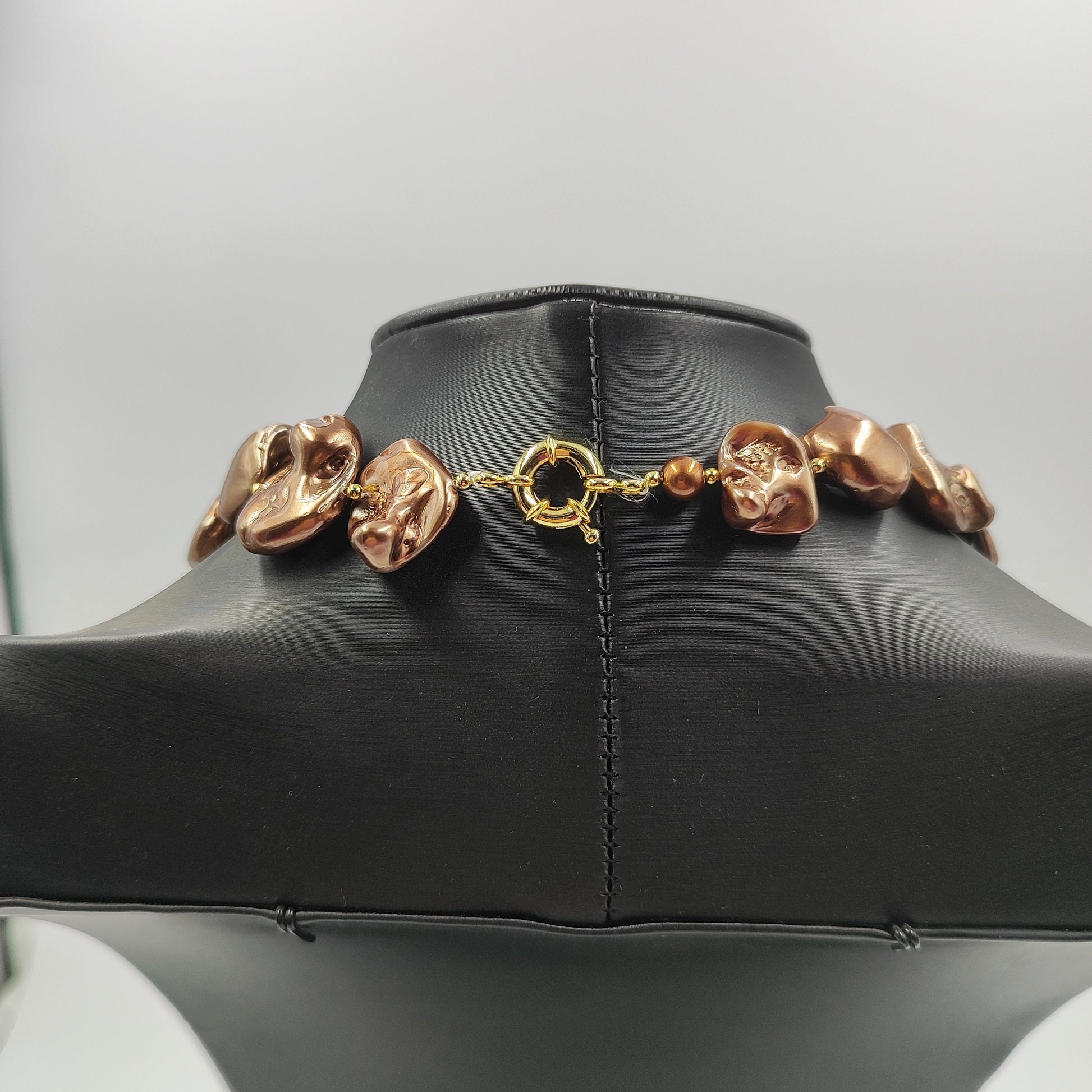 Collana esclusiva Shell Pearl Elegance, Codice GA0018, con perle di forma barocca irregolare in marrone. La lucentezza profonda si abbina perfettamente alle perle scultura color oro che fungono da distanziatori. Gioiello moderno con nucleo in madreperla, che offre una sensazione di lusso e un peso realistico.